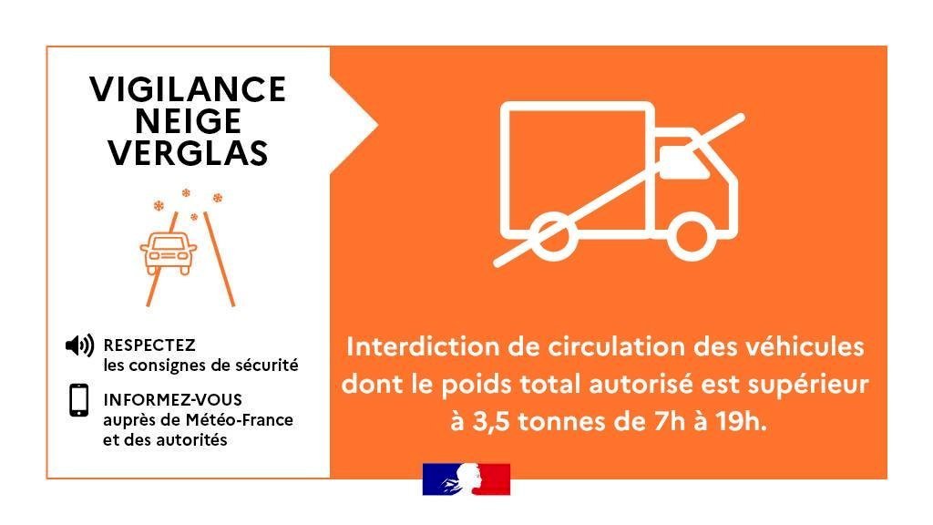 l’interdiction de circulation des véhicules de plus de 3,5 tonnes de PTAC, de 7h à 19h.